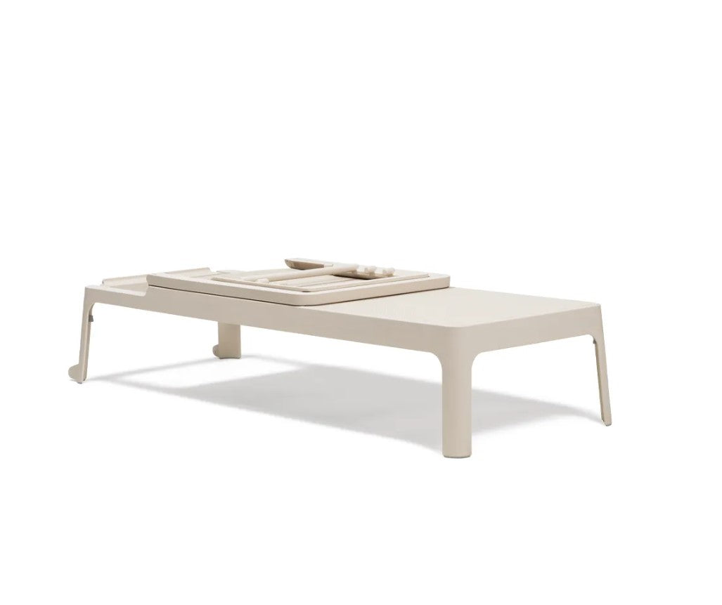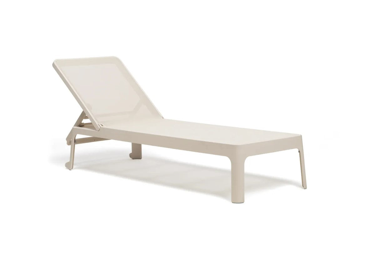 Lo schienale regolabile in 4 posizioni, fino alla completa planarità, consente di adattare il lettino a ogni esigenza, dalla lettura al riposo totale. La struttura senza braccioli e il design impilabile lo rendono estremamente pratico e salvaspazio.