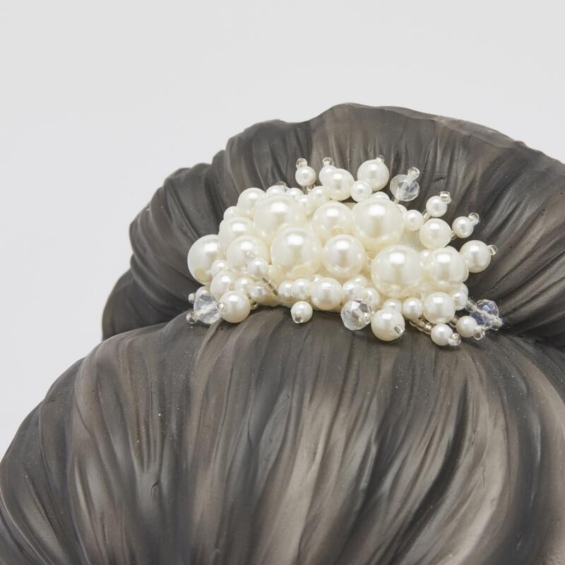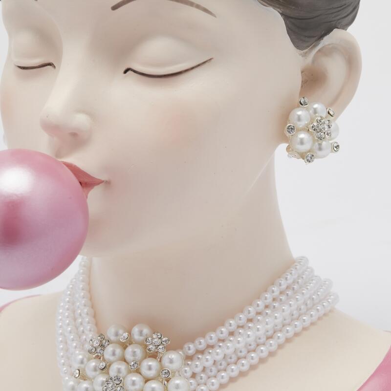 Made of waterproof polyresin , it represents the bust of a lady with refined details such as the pearl jewel , the impeccable hairstyle and the cute pink bubble , a symbol of irony and modern style.