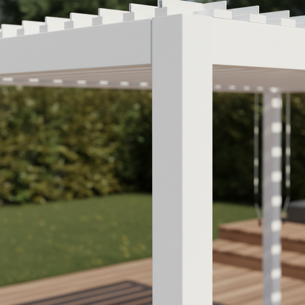 The water drainage system is integrated into the support posts: water collected by the blades flows internally through the posts to the ground, eliminating external gutters and maintaining a clean and tidy appearance.