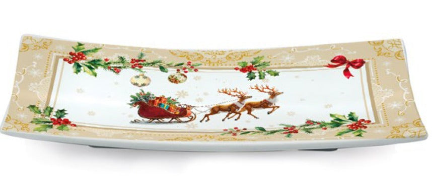 Crafted from decorated porcelain , it features a beautiful Christmas scene with Santa Claus in his sleigh pulled by his reindeer , framed by holly decorations, red bows, and gold details. Perfect for serving sweets, cookies, or appetizers during the holidays.