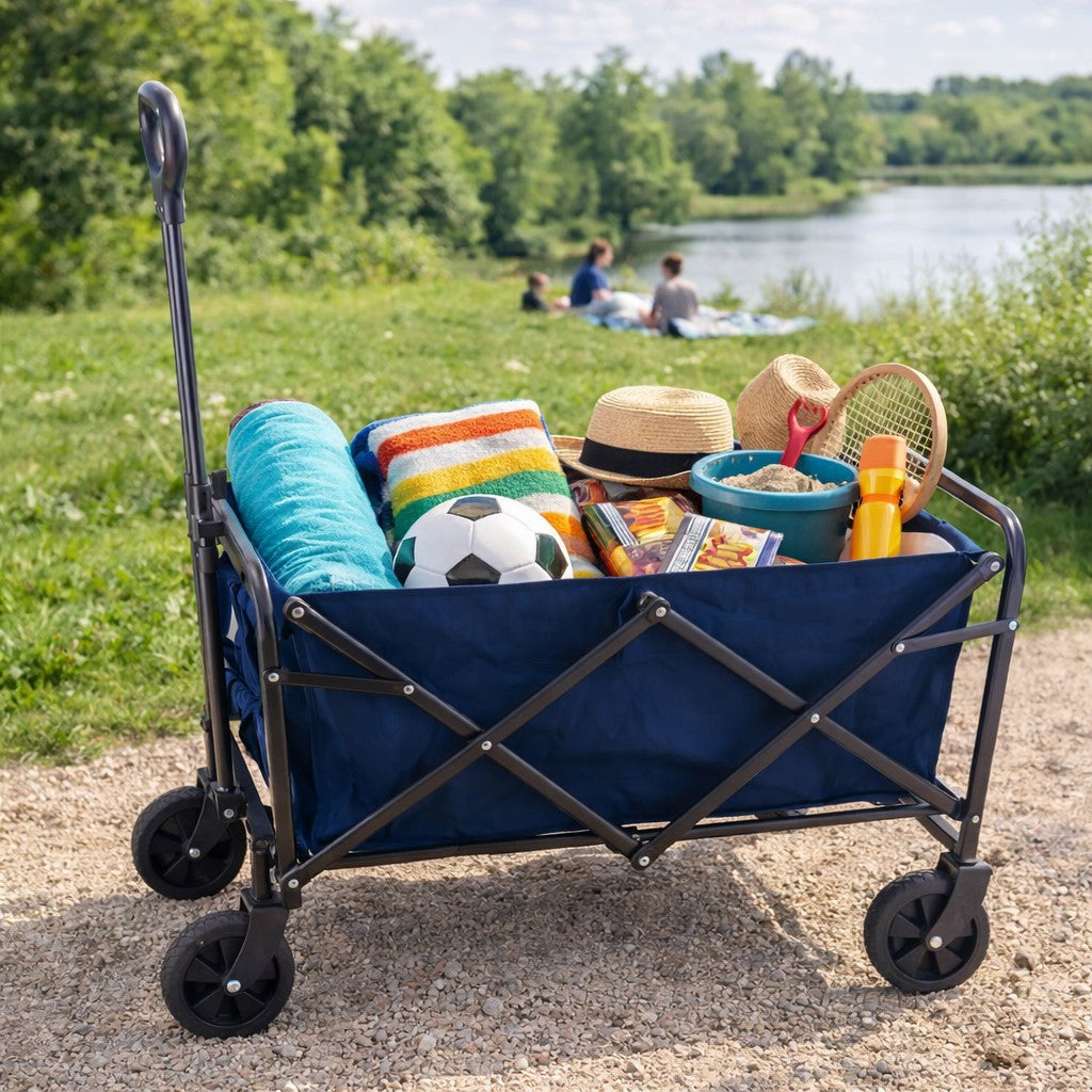 Grazie al sistema pieghevole, il carretto può essere chiuso rapidamente per essere riposto con il minimo ingombro, risultando ideale anche per il trasporto in auto. Con dimensioni 79 x 49 cm e altezza 90 cm, offre spazio sufficiente per borse frigo, attrezzatura da spiaggia, giochi, accessori per picnic e molto altro.