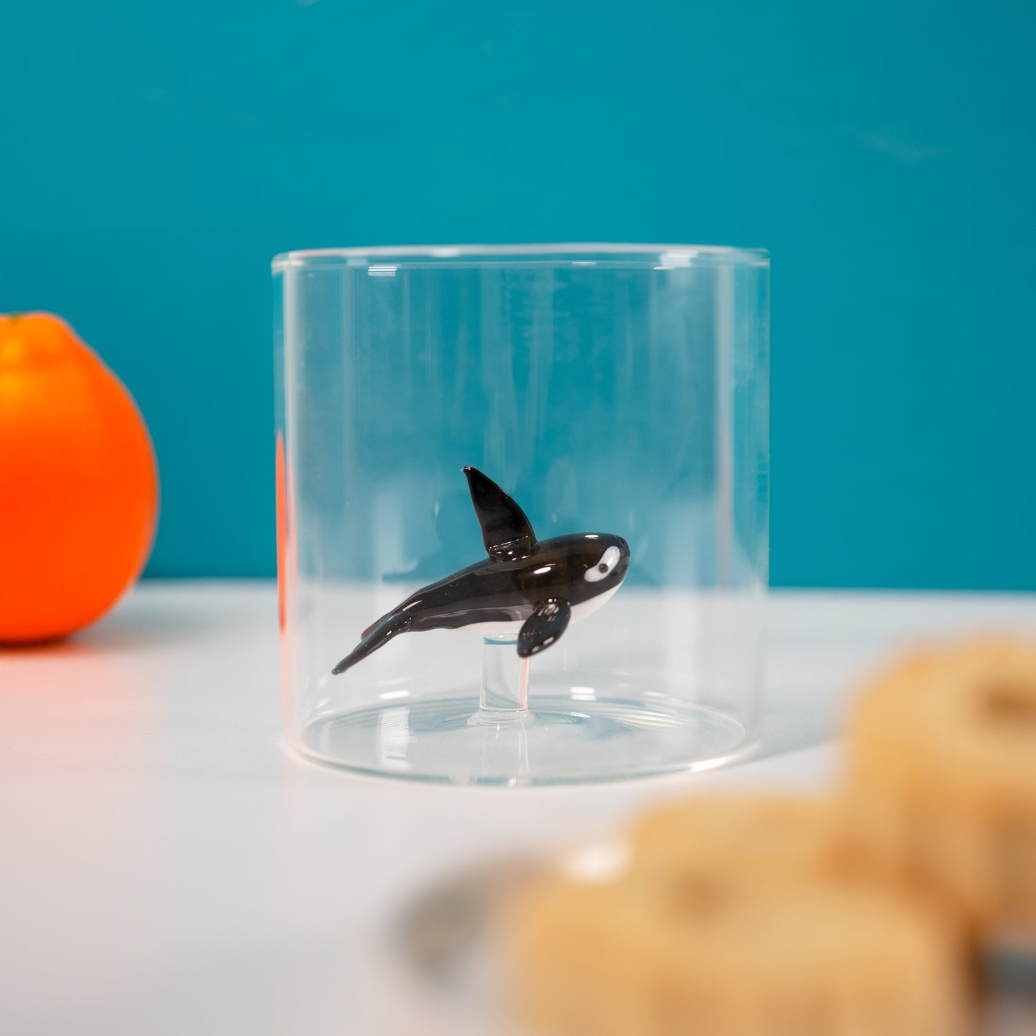 All’interno del bicchiere è presente una scultura tridimensionale di orca in vetro soffiato, realizzata artigianalmente a mano e fissata su un supporto trasparente. Ogni bicchiere è un pezzo unico, con leggere variazioni che valorizzano l’autenticità della lavorazione artigianale.